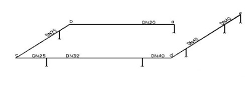 c-d段上設h和k點,這樣g-c和c-h形成“г”型補償器, k-d和d-p形成另一“г”型補償器。根據管徑查表1知c-h長度介于2.5m到18m之間,本系統定為15m; k-d長度介于3m到20m之間,本系統定為15m.。h-k長度為33m設置一個方形補償器,詳見國標圖N106,本不再贅述。設定好固定支架和補償器的系統如圖2所示。