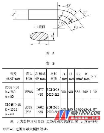 芯棒頭材質(zhì)一般有ZG1Cr18Ni9Ti 、ZG3Cr20Ni14 、ZG1Cr25Ni20Si2 、ZG0Cr20Ni25 等,高溫強(qiáng)度及耐磨性逐漸升高,價(jià)格也是相應(yīng)升高。如果是小批量生產(chǎn),可以選擇ZG1Cr18Ni9Ti 、ZG3Cr20Ni14 ; 如果是大批量生產(chǎn),應(yīng)選擇ZG3Cr25Ni20 Si2 、ZG0Cr20Ni25 ,但ZG0Cr20Ni25 價(jià)格太高,故這次試驗(yàn)芯棒頭材質(zhì)選用了ZG1Cr25Ni20 Si2 。芯棒頭按曲率半徑分為單曲率、雙曲率和多曲率三種。單曲率、雙曲率、多曲率芯棒,推力逐漸減小,制作成本逐漸升高。本次試驗(yàn)選雙曲率芯棒。按截面形狀分為圓截面和橢圓截面兩種,圓截面制作簡(jiǎn)單,成本低,但推制彎頭的橢圓度及減薄率過大;橢圓截面制作復(fù)雜,成本高,但推制彎頭的橢圓度及減薄率小。本次試驗(yàn)選橢圓截面芯棒。按是否有整形段分為有整形段芯棒頭和無整形段芯棒頭兩種。有整形段芯棒制作復(fù)雜,成本高,使用時(shí)間長(zhǎng); 無整形段芯棒制作簡(jiǎn)單,成本低,但前端磨損快。本次試驗(yàn)選有整形段芯棒。