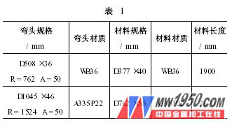 ( 5) 推制彎頭的檢測(cè)結(jié)果及分析 對(duì)推制彎頭用測(cè)厚儀檢測(cè)了外弧、側(cè)弧和內(nèi)弧壁厚,用平臺(tái)劃線方式檢測(cè)了曲率半徑、端口截面直徑和長(zhǎng)度加工余量。D508mm×36mm、R = 762mm、A = 50mm WB36彎頭的檢測(cè)結(jié)果如表7 、表8 所示。