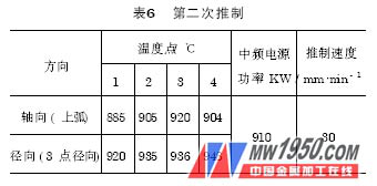 溫度分布是一個(gè)重要的工藝參數(shù),由感應(yīng)圈形狀及感應(yīng)圈與芯棒頭相對(duì)位置直接控制。感應(yīng)圈形狀是主要因素,感應(yīng)圈與芯棒頭相對(duì)位置是次要因素。溫度沿芯棒頭軸向分布規(guī)律為低、中、高、中,溫度沿芯棒頭徑向分布規(guī)律為低、中、高。加熱溫度高,推制彎頭壁厚增大。推制D508mm×36mm、R = 762mm、A = 50mmWB36 鋼的試驗(yàn)溫度如表3 、表4 所示。