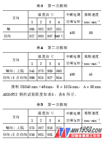 ( 4) 為保證壁厚及順利成形,WB36 材質(zhì)加熱溫度最高點(diǎn)880 ~900 ℃,A335P22 材質(zhì)加熱溫度最高點(diǎn)900~920 ℃。