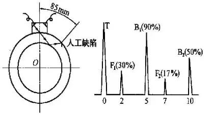 管路補償接頭此狀態下,探頭中心線至人工缺陷的周向距離為85mm,衰減器讀數為38dB。我們將此狀態定為原始狀態,下面分三種情況進行試驗。