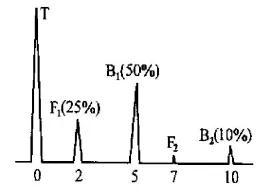 在原始狀態下,用蘸水的濕布觸摸人工缺陷,此時波幅變化情況如圖2所示。可見,降至滿幅的75%(-l.6dB), F1 降至滿幅的27%(-0.9dB);B2降至滿幅的30%(-4.4dB), F2降至滿幅的14%(-1.7dB)。在此情況下,管路補償接頭通波及缺陷波較原始狀態均有所下降,說明這是能量衰減所致。