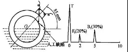 將探頭置于樣管上,找到人工缺陷,將一次通波B1調到5格,幅度為滿幅的90%,二次通波B2調到10格,管路補償接頭幅度為滿幅的50%;—次缺陷波F1在2格處,幅度為滿幅的30%,二次缺陷波F2在7格處,幅度為滿幅的17%(圖1)。