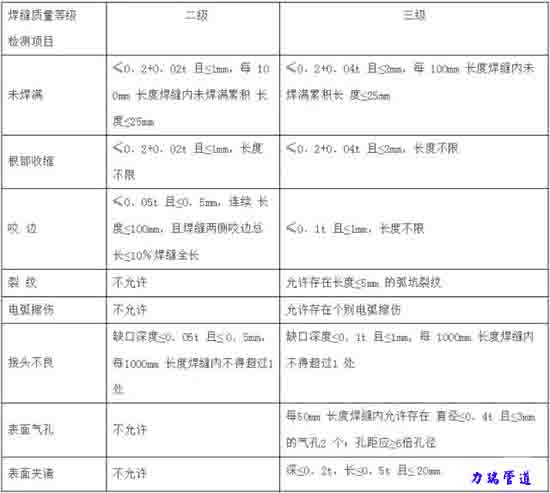 Ⅱ級焊縫:咬邊深度≤0.05t,且≤0.5mm,連續(xù)長度≤100mm,且兩側(cè)咬邊總長≤10%焊縫長度。