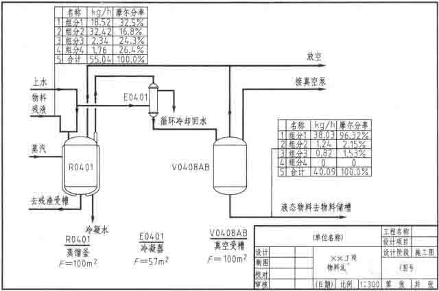 3)常采用圖形與表格結合的形式,并配以物料流程線,同時在流程線上標注出各物料的名稱、流量以及設備特性數(shù)據(jù)等。