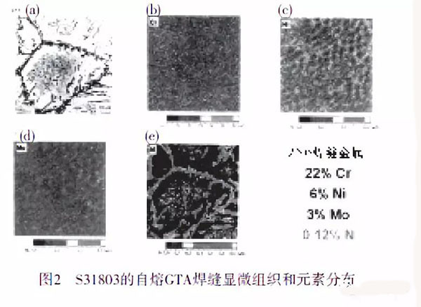 圖3所示為當(dāng)2205合金氮含量高于圖2所示的氮含量,滿足了UNS S31803和S32205的成分極限,其GTA熔化區(qū)的顯微組織和合金元素的分布。由于圖3中焊縫金屬的氮含量較高(氮含量為0.18%,與其相比,圖2的氮含量為0.12%),顯著地改變了焊后組織。