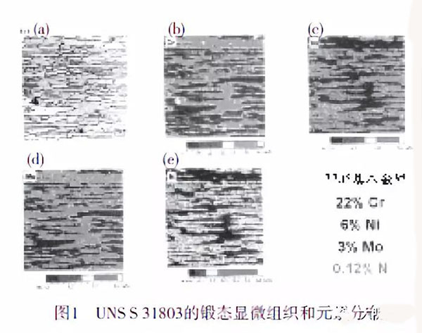 圖1~3就取自他們的報(bào)告。圖1所示為與UNS S31803成分符合,但與UNS S32205成分不符合的鍛鋼的顯微組織和其鐵素體相與奧氏體相之間的合金元素分布。對S32205來說,0.12%的氮含量太低。在圖1(a)中鐵素體為較暗的灰色,而奧氏體幾乎為白色。從圖可看出,在鐵素體相內(nèi),富含鉻和鉬,在奧氏體相內(nèi)富含鎳和氮。