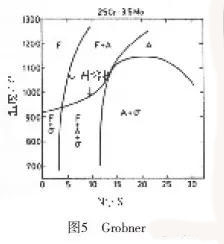 一般的要求是在最低1040℃的溫度進(jìn)行退火,然后從退火溫度進(jìn)行水淬。由于人們不太了解在加熱到退火溫度的過程中,雙相不銹鋼中幾乎總是形成σ相,而鎳含量較高會使σ相的固溶相線溫度增高。在這種情況下,富鎳的焊縫金屬就危險(xiǎn)。Grobner制做的圖5所示為鎳對25%Cr-3.5%Mo合金σ相固溶相線溫度的影響。