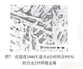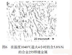可得出這樣的結(jié)論,在溫度1040℃時,該成分內(nèi)的σ相穩(wěn)定。注意,由于退火時間長,與后面所示的相比,其顯微組織要粗大得多。圖6所示為與合金255成分(5.8%Ni)完全相匹配的焊縫金屬。焊縫金屬是水淬前在溫度1040℃退火4個小時,它不含σ相,延展性相當(dāng)好(在4∶1標(biāo)距長度與直徑比的拉伸試驗(yàn)中,伸長率為34%)。
