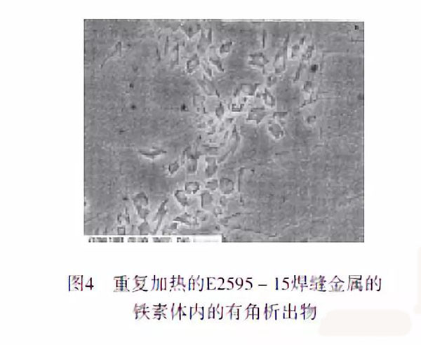 為了找出焊縫金屬沖擊試驗(yàn)結(jié)果不高的原因,利用掃描電子顯微鏡檢測了工藝評定測試用的焊縫試樣。圖4所示為試樣中部厚度附近焊縫金屬的顯微組織。僅在鐵素體內(nèi)就有大量的有角析出物。但是沒有準(zhǔn)確確定到底是什么析出物。我們的結(jié)論是析出物是在對測試試樣進(jìn)行十二道次的焊接時反復(fù)重復(fù)加熱產(chǎn)生的。