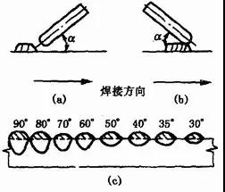 (2)電極(焊絲)傾角焊接時,電極(焊絲)相對于焊接方向可以傾斜一個角度。當電極(焊絲)的傾角順著焊接方向時叫后傾;逆著焊接方向時叫前傾,見圖1—32(a)、(b)。電極(焊絲)前傾時,電弧力對熔池液體金屬后排作用減弱,熔池底部液體金屬增厚了,阻礙了電弧對熔池底部母材的加熱,故焊縫厚度減小。同時,電弧對熔池前部未熔化母材預熱作用加強,因此焊縫寬度增加,余高減小,前傾角度。愈小,這一影響愈明顯,見圖1—32(c)。