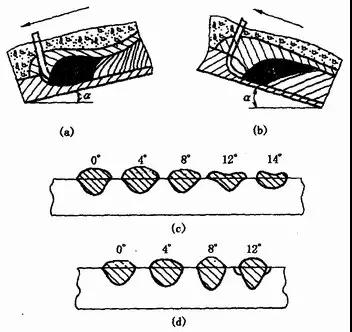 圖1—32 電極(焊絲)傾角對焊縫形狀的影響