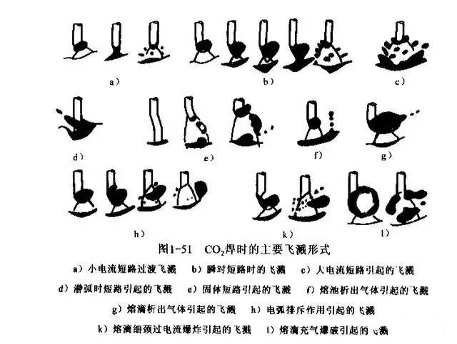 CO2焊時(shí)的飛濺形式如圖所示。從中可以看到大致有三種,一為由短路引起的飛濺;二為由氣體析出引起的飛濺;三為由自由過渡時(shí)引起的飛濺。