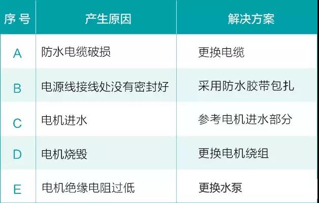 處理方法:檢查電路電壓,降低水泵轉速;矯正水泵主軸或調整水泵與電機的相對位置;選用合適揚程的水泵;清理泥沙或堵塞物;更換電機的滾珠軸承。