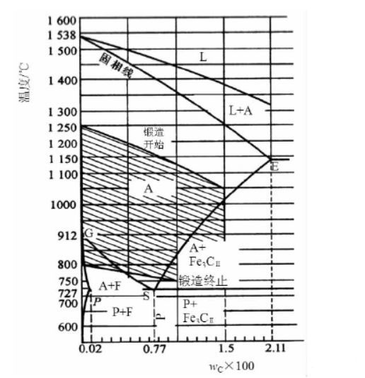 對(duì)金屬加熱的要求是:在坯料均勻熱透的條件下,能以較短的時(shí)間獲得加工所需的溫度,同時(shí)保持金屬的完整性,并使金屬及燃料的消耗最少。其中重要內(nèi)容之一是確定金屬的鍛造溫度范圍,即合理的始鍛溫度和終鍛溫度。碳鋼的鍛造溫度范圍見(jiàn)圖1。