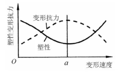 變形速度即單位時(shí)間內(nèi)的變形程度。變形速度對(duì)金屬可鍛性的影響如圖2所示。由圖可見(jiàn),它對(duì)可鍛性的影響是矛盾的。一方面隨著變形速度的提高,回復(fù)和再結(jié)晶來(lái)不及進(jìn)行,不能及時(shí)克服加工硬化現(xiàn)象,使金屬的塑性下降,變形抗力增加,可鍛性變壞(圖中a點(diǎn)以左)。另一方面,金屬在變形過(guò)程中,消耗于塑性變形的能量有一部分轉(zhuǎn)化為熱能,相當(dāng)于給金屬加熱,使金屬的塑性提高、變形抗力下降,可鍛性變好(圖中a點(diǎn)以右)。變形速度越大,熱效應(yīng)越明顯。
