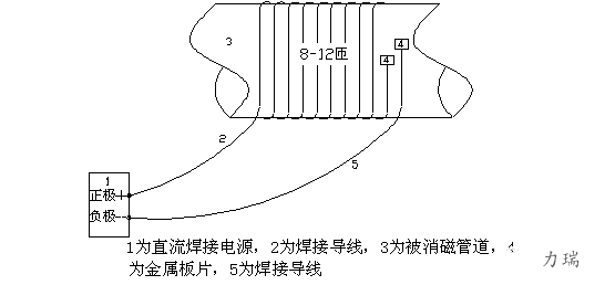 在個(gè)別場(chǎng)合下,推薦使用將電焊鉗和金屬板片接入電氣系統(tǒng)中消磁的方案。將裝入電焊鉗中的焊條,在300 A 電流下與金屬板短路約10 s。然后斷開。在每一次短路、斷開循環(huán)之后,檢查管道磁性強(qiáng)弱,并在必要時(shí)重復(fù)上述消磁過程。