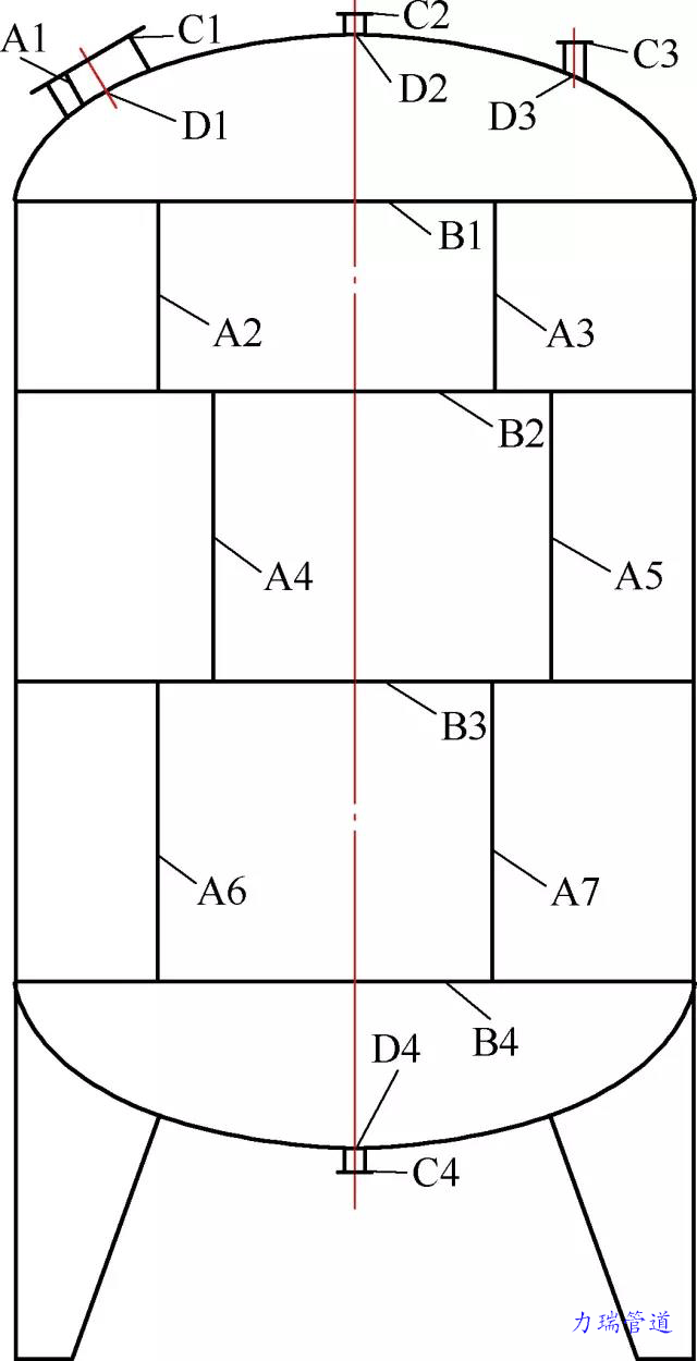 首先生產(chǎn)前要對(duì)使用的材料進(jìn)行檢測(cè),包括化學(xué)成分和力學(xué)試驗(yàn),材料經(jīng)檢測(cè)合格后才能投入使用,這主要是保證材料的安全性和可靠性。根據(jù)容器的圖樣,做出下料尺寸,然后就可以做出標(biāo)有焊縫的容器簡(jiǎn)圖。一般容器代號(hào)分為A、B、C、D四類。A代表縱焊縫、B代表環(huán)焊縫,C代表法蘭端面焊縫,D代表接管焊縫。將字母標(biāo)注在每道焊縫上,并按序標(biāo)上數(shù)字(見圖1)。隨后將標(biāo)注好字母與數(shù)字的容器簡(jiǎn)圖交給車間,讓操作者熟悉這些焊縫,因?yàn)檫@些焊縫都是受壓焊縫,有不同的焊接工藝。