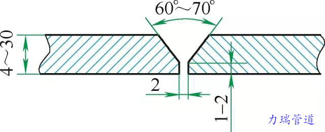 (2)焊縫的對(duì)接 從圖1可看出A類焊縫(縱焊縫)有7處,A1~A7。B類焊縫(環(huán)焊縫)有4處,B1~B4。縱焊縫和環(huán)焊縫是容器上的關(guān)鍵焊縫,也是重點(diǎn)監(jiān)測(cè)焊縫。按照隔熱管托工藝要求,在對(duì)接前在焊縫處加工出坡口。因?yàn)槿萜饔娩摪搴穸炔煌云驴谝膊煌R话闱闆r下板厚在4~30mm之間,采用V形坡口(見圖2)。有時(shí)坡口形式也會(huì)標(biāo)注在圖樣上,并注有技術(shù)說(shuō)明。加工坡口根據(jù)鋼板的厚度可選用坡口機(jī)、碳弧氣刨、角磨機(jī)等,加工好坡口后要進(jìn)行檢驗(yàn):①不能有裂紋。②不能分層。③不允許有熔渣。④表面需平整。焊前,坡口表面要進(jìn)行擦洗,清除表面及坡口周邊的氧化物、油污和夾雜等妨礙正常焊接的雜物。