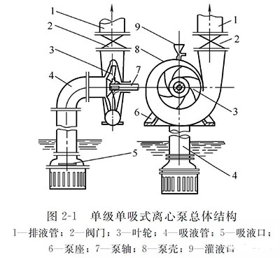 圖2-1為單級單吸式離心泵總體結構簡圖。從圖中可以看出,離心泵包括蝸殼形的泵殼8和裝于泵軸7上旋轉的葉輪3,隔熱管托及蝸形泵殼的吸液口與吸液管4相連接,排液口通過閥門2與排液管1相連接。