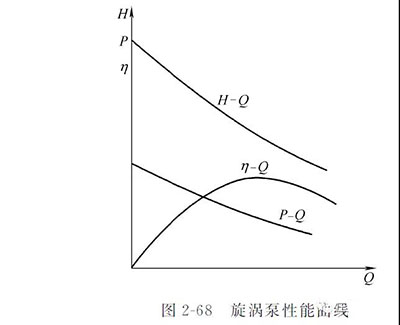 而當流量越小,則液體在葉輪內的圓周速度和在環形流道內的圓周速度相差越大,離心力相差也越大,隔熱管托縱向旋渦也隨之變大,壓頭也越高。圖2-68和圖2-69為旋渦泵性能曲線及其實例。由兩圖可見,流量減小時,壓頭就增加。