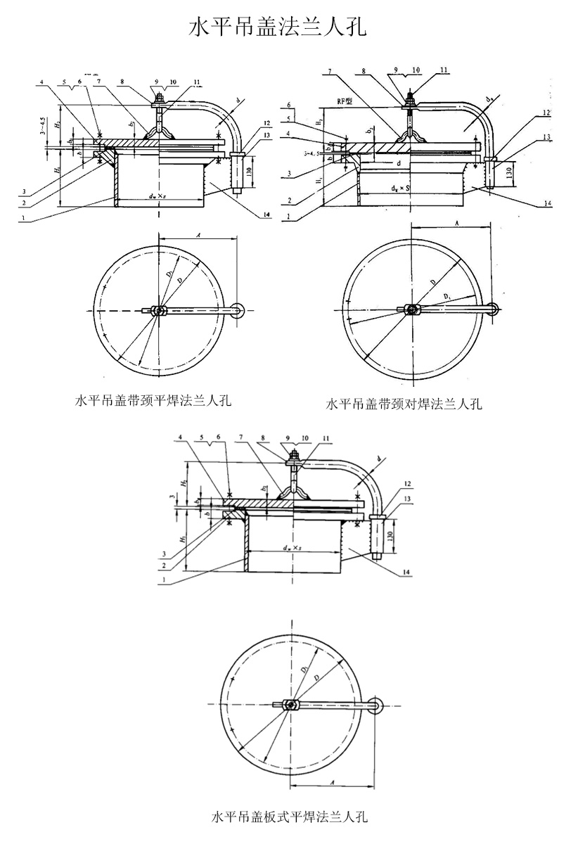水平吊蓋板式平焊法蘭人孔、水平吊蓋帶頸平焊法蘭人孔、水平吊蓋帶頸對焊法蘭人孔
